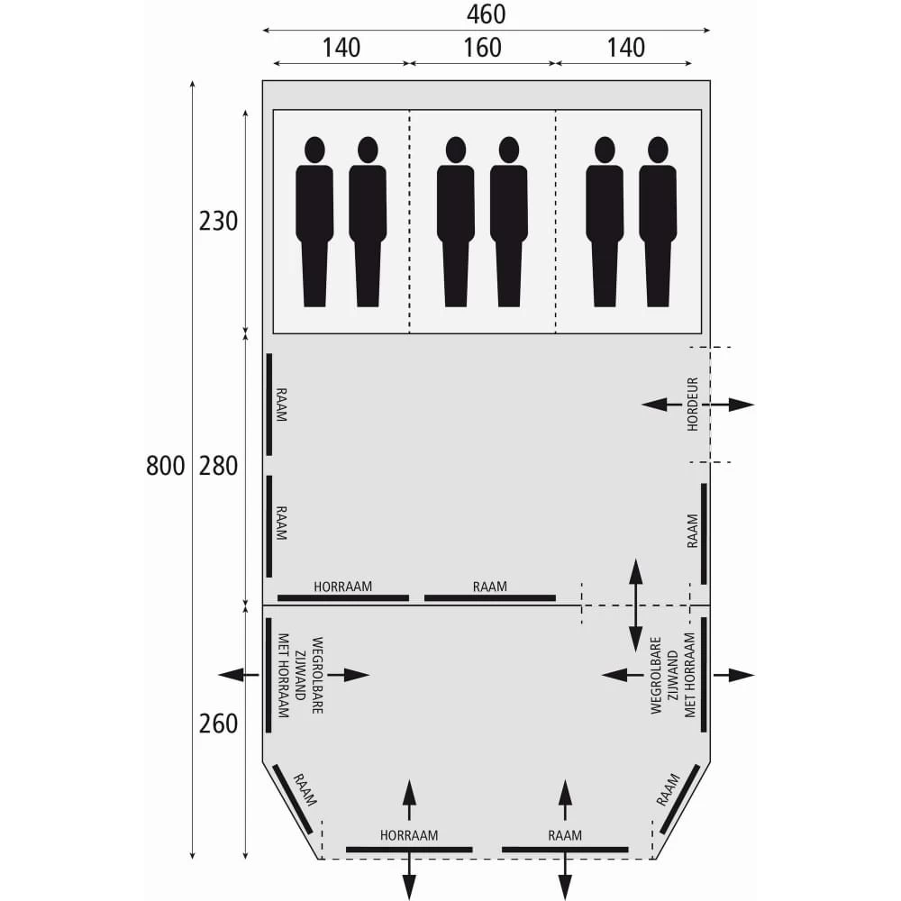 Bardani maakt deze tent niet alleen extra breed en lang maar ook de stahoogte in de leefruimte is hoog te noemen. Met 215 cm kan vrijwel iedereen hier probleemloos in- en uit lopen. Mocht je de leefruimte nu nog niet groot genoeg vinden, dan kan je de wand naar de luifel ook nog weghalen. De voorwand van de luifel is ook weg te halen en hier zitten pvc ramen en horrengaas in.