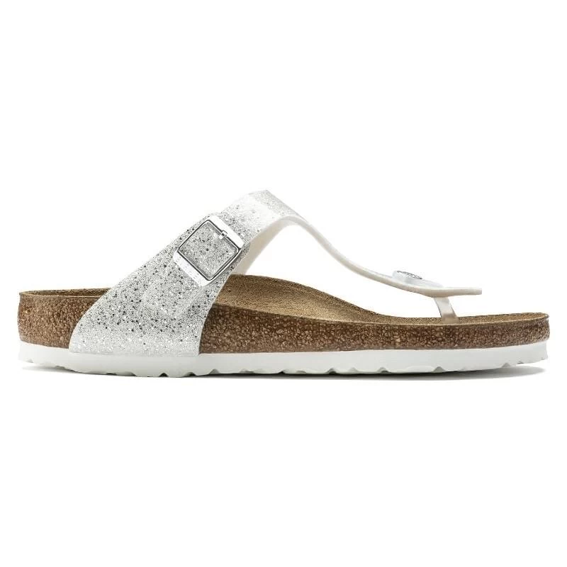 De Birkenstock Gizeh is een echte klassieker die optimale steun combineert met een minimalistisch, modieus design. De variant Cosmic Sparkle heeft een opvallend glittereffect en een hoogglanzende finish. Hierdoor heeft de teenslipper een fonkeling en ogen ze heel elegant. Het bovenmateriaal bestaat uit het huidvriendelijke en stevige synthetische materiaal Birko-Flor®.