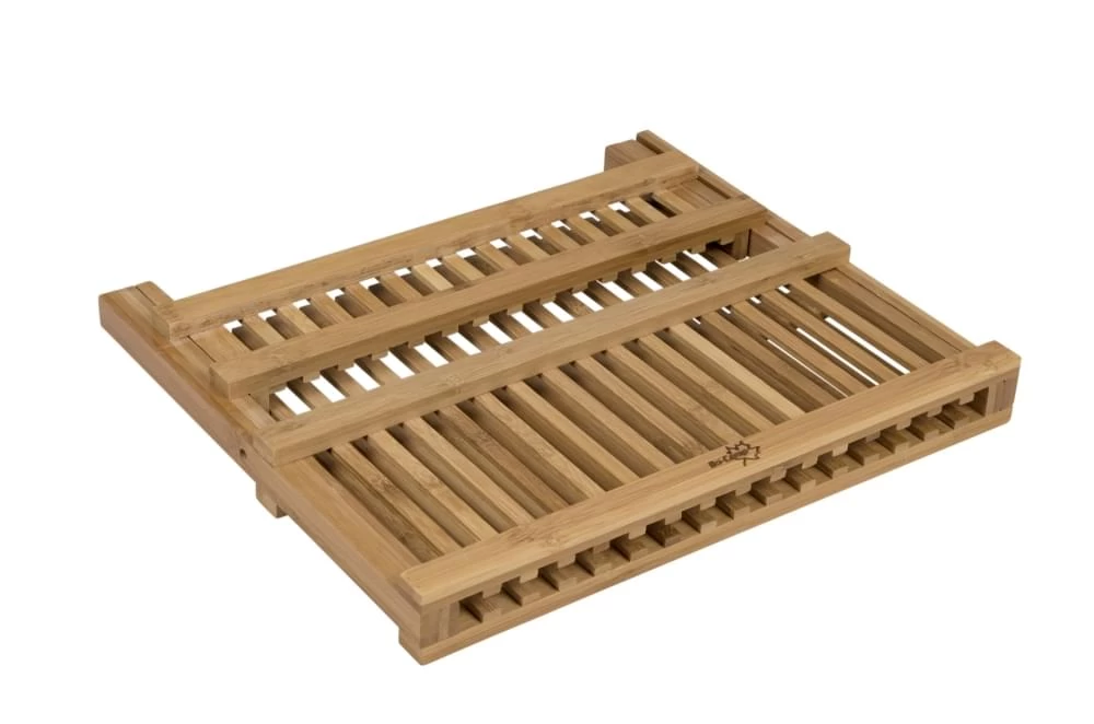 Inklapbaar afdruiprek voor de afwas op de camping. Het rek kan ingeklapt worden en is gemaakt van bamboe.