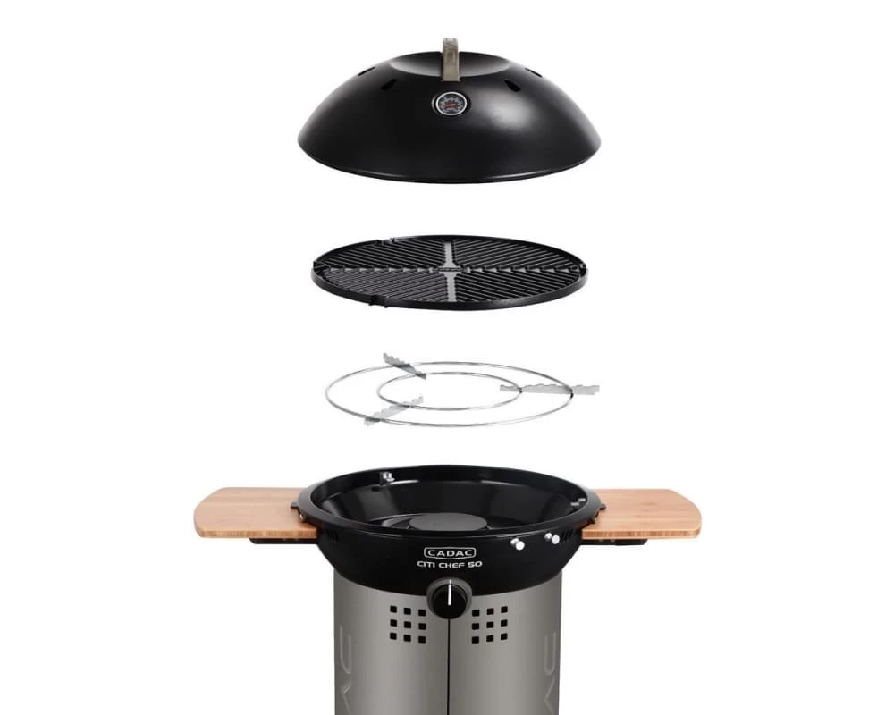 Een nieuw model van Cadac: de Citi Chef 50. Een hippe gasbarbecue die compact is maar wel alles biedt wat je nodig hebt. De Citi Chef 50 heeft een geëmailleerde deksel waar een thermometer in zit, zodat je ook de temperatuur in de deksel goed kan zien.