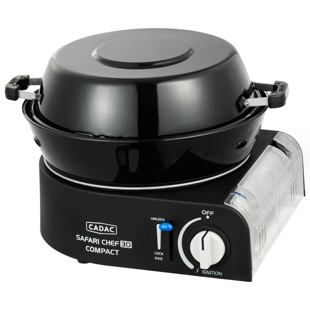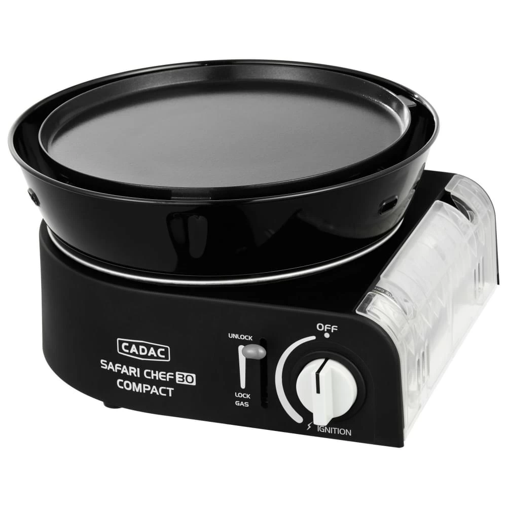 De Safari Chef Compact 30 is een ultra compacte en met zijn gewicht van 3,8 kg een lichtgewicht gasbarbecue. Ondanks dat deze gasbarbecue van Cadac compact is heeft hij toch een kookoppervlak met een diameter van 30 cm. De barbecue werkt op 227 gr gasblikjes. Dit gaspatroon klik je in het toestel en je kunt gelijk barbecueën. Ook het aansteken van de Safari Chef Compact 30 gaat gemakkelijk, met de piëzo-ontsteking heb je geen lucifers of aansteker meer nodig.