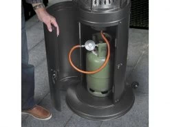 Deze terrasverwarmer heeft wieltjes aan de onderkant en een handvat aan de zijkant waardoor je hem makkelijk kan verplaatsen. Niet alleen zorgt hij ervoor dat je er lekker warmpjes bij zit, door zijn zwarte omkasting(lijkt op hamerslag) ziet hij er ook nog eens stijlvol uit.