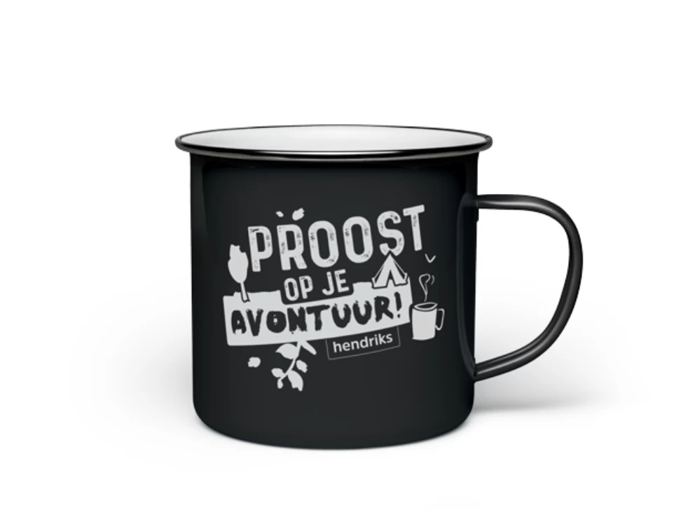 Mooie emaille mok met onze eigen opdruk; ‘Proost op je avontuur!’ Leuk voor op de camping of thuis en deze Hendriks mok mag natuurlijk niet ontbreken bij jou op de camping!