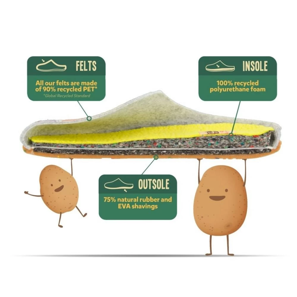 De binnenzool is gemaakt van 100% gerecycled PU en de buitenzool van natuurlijk rubber en gerecycelde kunststof snippers. Met uitneembare inlegzool. Hot Potatoes zijn koud wasbaar. Comfortabel en Made in Spain.