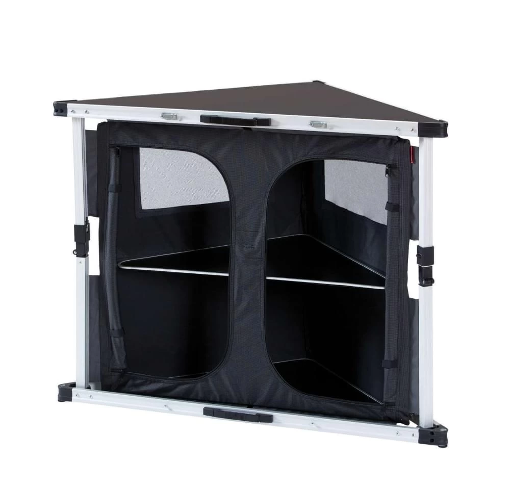 Wil je de ruimte in de voortent optimaal benutten? Dan is deze opvouwbare hoekkast van Isabella misschien wel de kast voor jou. Hij heeft driehoekige opbergschappen (x 2) en een hard bovenblad van 82 x 82 cm. Het kastje is 85 cm hoog en weegt slechts 9 kilo.