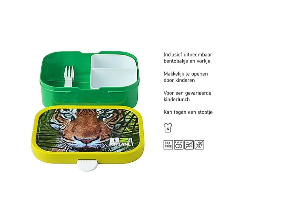 Deze Mepal lunchbox Campus is voorzien van een stoere Tijger opdruk. In de broodtrommel passen met gemak 4 boterhammen. Wanneer je van variatie houdt kun je met het meegeleverde bentobakje ook de trommel in verschillende delen opdelen. Zo heb je naast je boterhammen ook plek voor andere lekkere dingen, zoals wat fruit of nootjes. De broodtrommel is BPA-vrij en vaatwasmachinebestendig.