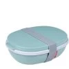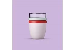 In de deksel van de Lunchpot Ellipse van Mepal doe je de muesli, blauwe bessen of andere toppings. In de beker neem je yoghurt of kwark mee. En is het tijd om te lunchen dan doe je de topping op je yoghurt, of je kan er natuurlijk ook voor kiezen om het fruit later op te eten.