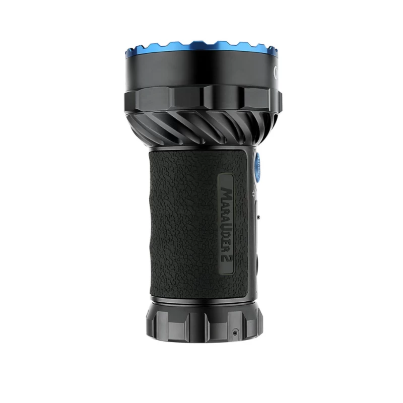 Deze compacte en multifunctionele lamp is dé ultieme alleskunner van Olight. De Marauder 2 is een handzame maar krachtige ver- en breedstraler. De twee verschillende standen kunnen op elk momoment ingesteld worden. Bovenop zit een unieke knop waarbij het instellen van lichtsterkte erg gemakkelijk gaat door deze te draaien. Daarnaast is de lichtsterkte gemakkelijk af te lezen. Met de 3 dikke Li-Ion batterijen kan de lamp tot wel 59 uur lang mee. De zaklamp kan daarnaast ook als powerbank gebruikt worden. De USB-C poort is waterproof en stof wordt buitengehouden door de diafragma afsluiting. De Marauder 2 is ook voorzien van Active Thermal Management (ATM) technologie, wat ervoor zorgt dat de lamp automatisch schakelt naar een lagere lichtsterkte bij te hoge temperaturen en de veiligheidssensor dimt de lamp automatisch wanneer er een voorwerp te dichtbij in de lichtbundel komt. De behuizing is voorzien van een comfortabele rubberen greep, wat zorgt voor een geïsoleerde en goede grip. Kortom de Marauder 2 is dé ultieme zaklamp van Olight.
