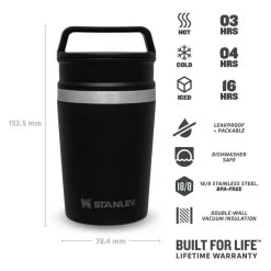 Voor onderweg, op het werk of misschien wel voor thuis; de Shortstack Travel mug van Stanley. Deze compacte thermosbeker is groot genoeg om er een dubbele espresso in te doen of misschien ga je wel voor je favoriete drankje met ijs. Hoe dan ook, de thermosbeker van Stanley heeft een fantastisch isolerend vermogen, drankjes blijven tot wel 3 uur warm en tot wel 4 uur koud. De deksel bestaat uit twee delen, het drinkgedeelte en de deksel om de thermosbeker volledig lekvrij af te sluiten. En voor de koffieliefhebbers; de Shortstack travel mug past onder de meeste koffiecupmachines.