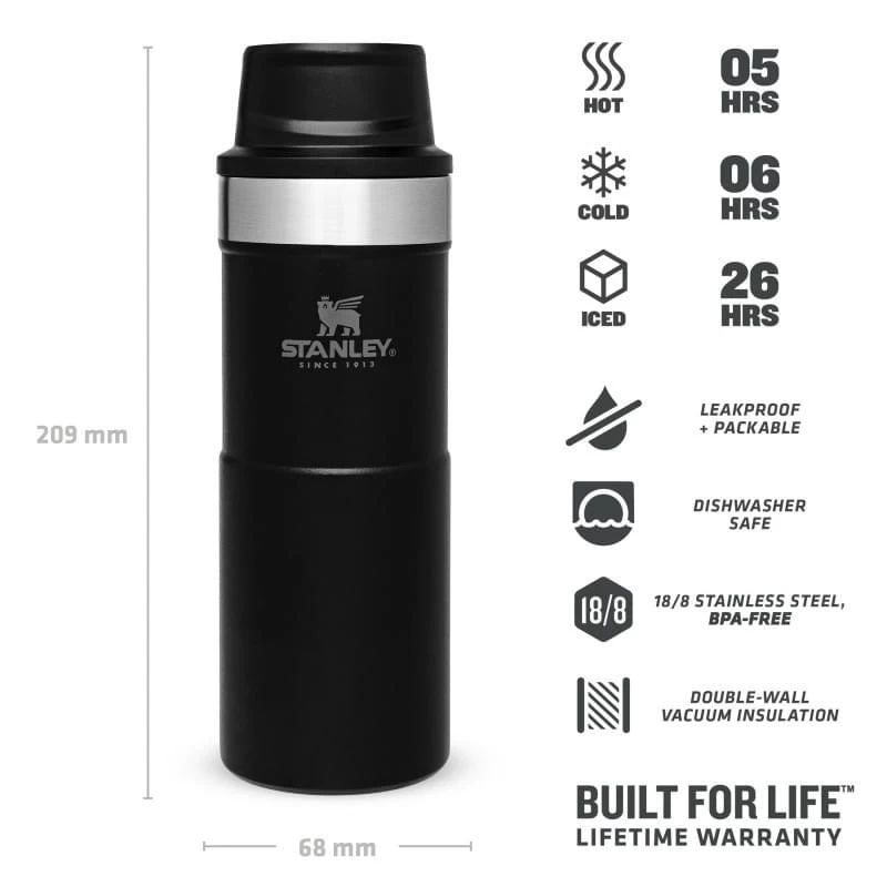 Voor wie vroeg op pad moet kan wel een sterk kopje koffie gebruiken om wakker te worden. Als geen ander heeft Stanley een thermosbeker in het assortiment die aan alle eisen voldoet. De beker is lekvrij, houd je kopje koffie of andere warme drank tot wel 5 uur warm en kan gewoon in de vaatwasser.