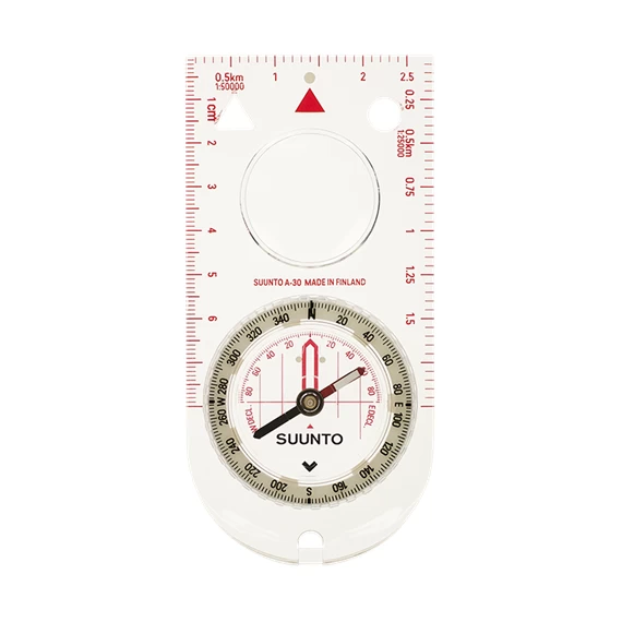 Plaatkompas met een vaste declinatieschaal. Een lichtgevende ring en afneembaar halskoord.